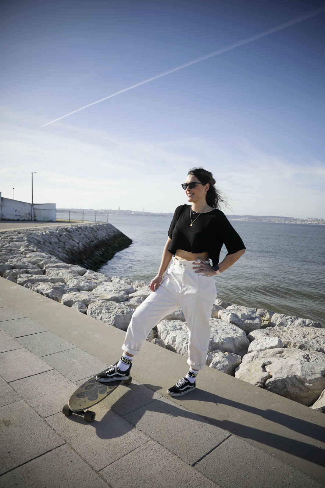 Ângela Guerreiro vive sozinha, no Barreiro, e integra o departamento jurídico de uma multinacional. A pandemia levou-a a arriscar no skate. Três vezes por semana desliza sobre rodas na marginal junto ao Tejo. A crónica falta de equilíbrio atrapalhou, mas sabia de uma coisa: não tem personalidade para desistir.